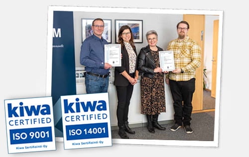 OEM:n laatu- sekä vastuullisuustyö ottivat ison harppauksen eteenpäin, kun saavutimme ISO 9001 ja ISO 14001 -sertifikaatit. ISO-standardien myötä edistyksemme on nyt tunnustettu kansainvälisesti. Tämän saavutuksen takana on koko organisaatiomme sitoutuminen kehitystyöhön.